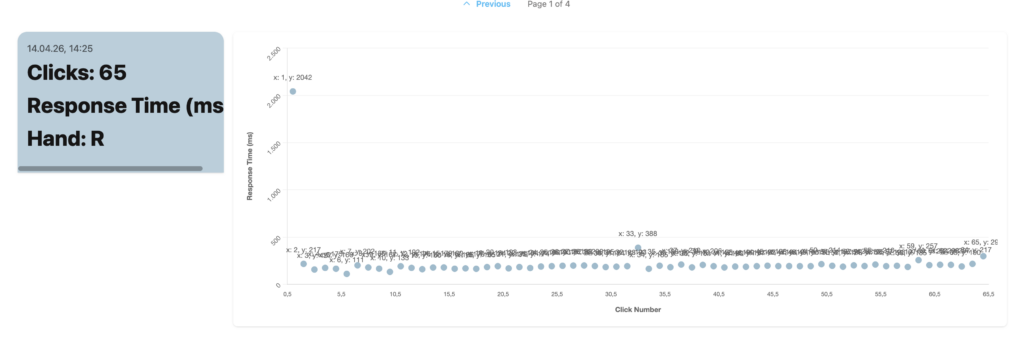 Diese Abbildung aus dem Patientenkonto im Ambulanzpartner-Portal zeigt die mit dem ALS-Stift erfasste Klick-Frequenz des Daumens und damit die gemessene Beweglichkeit des Daumens im Verlauf der Messung.