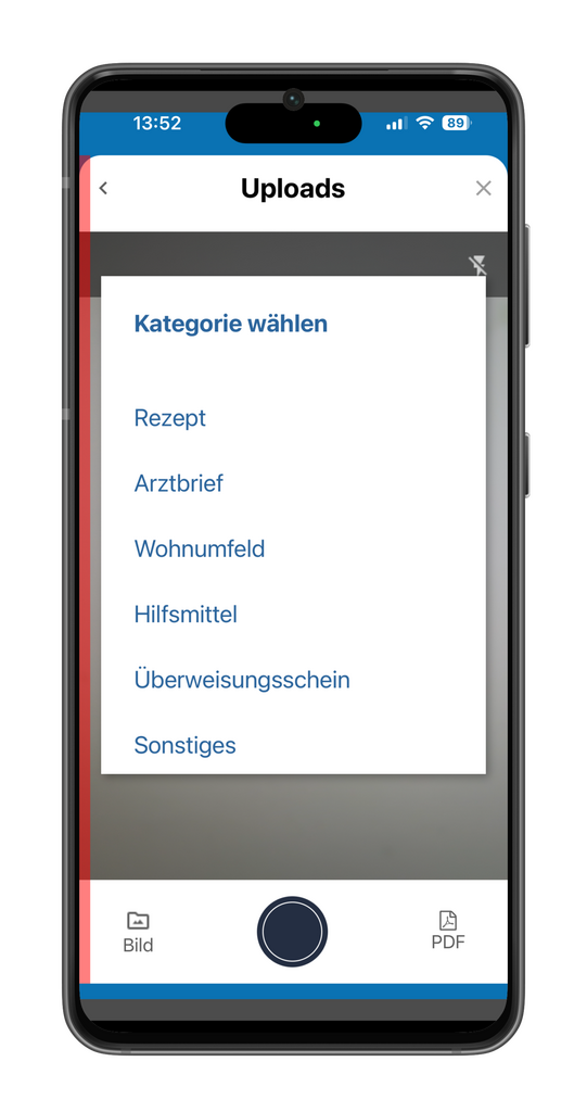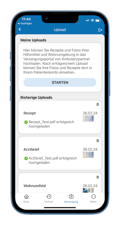 The ALS app has a scan function. This allows documents to be photographed (“scanned”), sorted into different categories (e.g. doctor’s letter, referral slip, prescription) and uploaded to the ALS app. These documents are visible in the app and are also synchronized with the user account on the APST care platform.