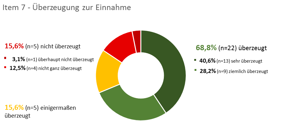 Abb. 10: Überzeugung oder fehlende Überzeugung von der Einnahme des Medikamentes Nabiximols. Die Überzeugung von der Einnahme von Nabiximols wurde anhand des TSQM-9, Frage 7 ermittelt: „Wie überzeugt sind Sie insgesamt davon, dass es gut für Sie ist, dieses Medikament zu nehmen?“; n = Anzahl der Patienten.