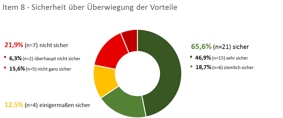 TSQM-9, Frage 8 – Sicherheit oder Unsicherheit über das Überwiegen guter oder schlechter Seiten des Medikamentes: Ein großer Teil der Befragten (65 %; n = 21) war sich sicher, dass die Vorteile der Einnahme gegenüber den Nachteilen überwiegen. 22 % (n = 7) nahmen das Medikament ein, obwohl sie nicht sicher sind, dass die positiven die schlechten Seiten des Medikamentes überwiegen. Eine weitere Gruppe (12,5 %, n = 4) war ambivalent (Abb. 11).