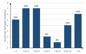 Im Mittel wurden 6,8 Sprühstöße pro Tag appliziert. 44 % der Befragten applizierten 1 bis 4 Sprühstöße pro Tag, während 22 % 5 bis 10 Sprühstöße anwenden. Weitere 19 % nahmen mehr als 10 Sprühstöße pro Tag ein (Abb. 2).
